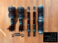 Airtekk airstruts with 33 way dampers shock and 3 ply rubber. Front airstruts with bellows and camber plates, rears with bellows. Comes with spanner wrenches, 4 dampers, and 4 1/4 fittings.