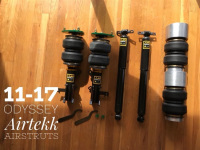 Airtekk airstruts with 33 way dampers shock and 3 ply rubber. Front airstruts with bellows and camber plates, rears with bellows. Comes with spanner wrenches, 4 dampers, and 4 1/4 fittings.