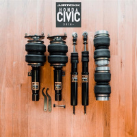 Airtekk airstruts with 33 way dampers shock and 3 ply rubber. Front airstruts with bellows and camber plates, rears with bellows. Comes with spanner wrenches, 4 dampers, and 4 1/4 fittings.